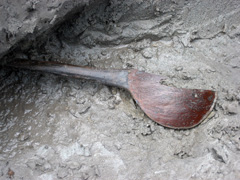 堀の中からは内耳鍋、かわらけなどの土器とともに、ひしゃくや漆塗りの杯など木製品も出土しています。当時の生活用品を知るうえで重要な資料です。