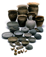 カマドに掛ける煮炊き具としての甕(かめ)や甑(こしき:蒸し器のこと)、食器としての蓋付の杯身(お茶碗)や皿や鉢、容器としての壺など、多くの須恵器(すえき)や土師器(はじき)が復元されました。