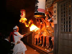 夜空を焦がす大松明とヒドリ役の若者たちとのもみあいが実に豪壮であるため「火踊り祭り」といい、なまって「ひよんどり」と呼びならわしています。