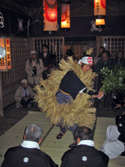 「ひよんどり」の名称は、前日3日に執り行われる寺野と同じですが、川名の場合は行事のはじめに大禰宜、小禰宜ほか祭礼に携わる一行が大松明を灯して八日堂へ献上するために階段から堂内に上り込んで来るところを、裸の若者たちが入り口で通せんぼをして競り合いになる次第があることから付けられています。