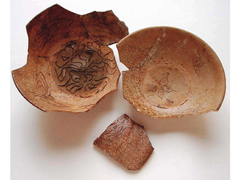 吉名古窯から出土した陶器は、数千点に及びます。これらのほとんどは、つまるところ、失敗作ですが、その内容は、日常食器から美しい模様のついた高級食器、役所用の硯、寺院用と思われる焼物と、バリエーションに富み、吉名古窯が大規模な陶器工場だったことが分かります。