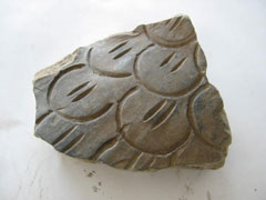出土品には天守門の屋根に葺かれていた軒丸瓦(のきまるかわら)や軒平瓦(のきひらかわら)に加え、屋根の最上部に配置されていた鯱瓦(しゃちかわら)の破片がみられます。