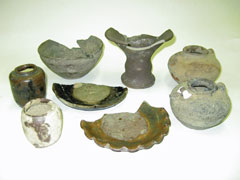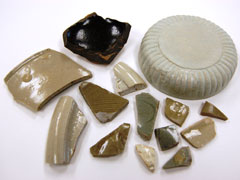 さらに、当時の高級食器である中国産陶磁器が出土しており、天目茶碗や青白磁合子などのめずらしい器種が含まれることや、宴会などの際に使用された「かわらけ」と呼ばれる素焼の土器皿が多数出土していることからも、階層性の高さがわかります。
