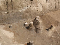 いずれも幅2~3mと、他の溝跡より大規模であり、年代についても山茶碗と呼ばれる陶質の焼き物が多く出土しているため、鎌倉時代に使われていたことが明らかです。