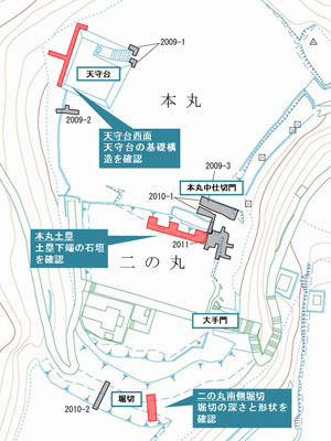 今回の発掘調査は、本丸天守台、本丸土塁、二の丸南側堀切の3箇所を調査対象にしています。