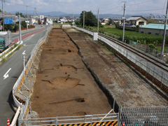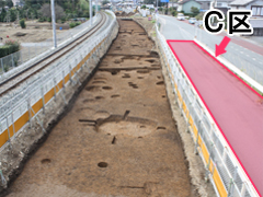 また、踏切南側のB調査区では、踏切から60mほどの間に竪穴住居跡を5棟確認しましたが、それより南側では弥生時代の遺跡はほとんど確認されず、集落の南端にあたるのではないかと推測されます。