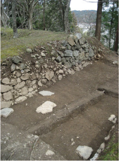 二俣城では、昨年度の発掘調査において本丸中仕切門の礎石( そせき) と石垣の一部を確認しています。