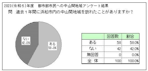 田園回帰の広がりやアウトドアブームにより中山間地域に対する注目は高まっているものの、都市部市民への中山間地域アンケート結果によると約4割の市民が過去1年間に浜松市内の中山間地域を訪れていないのが現状です。