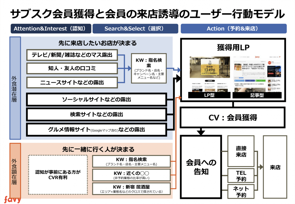 飲食店さまには、一定のメニューが定額制で「〇〇放題」になるプランを組んでいただくことで、再来店を前提としたお客様との関係構築が可能になります。favyサブスクのプラットフォーム上には、広告の閲覧から来店し会計を終える段階までエンドユーザーの行動データが集まります。そうしたデータを来店の動機づくりや接客に活用いただけることが、favyサブスクの提供価値です。