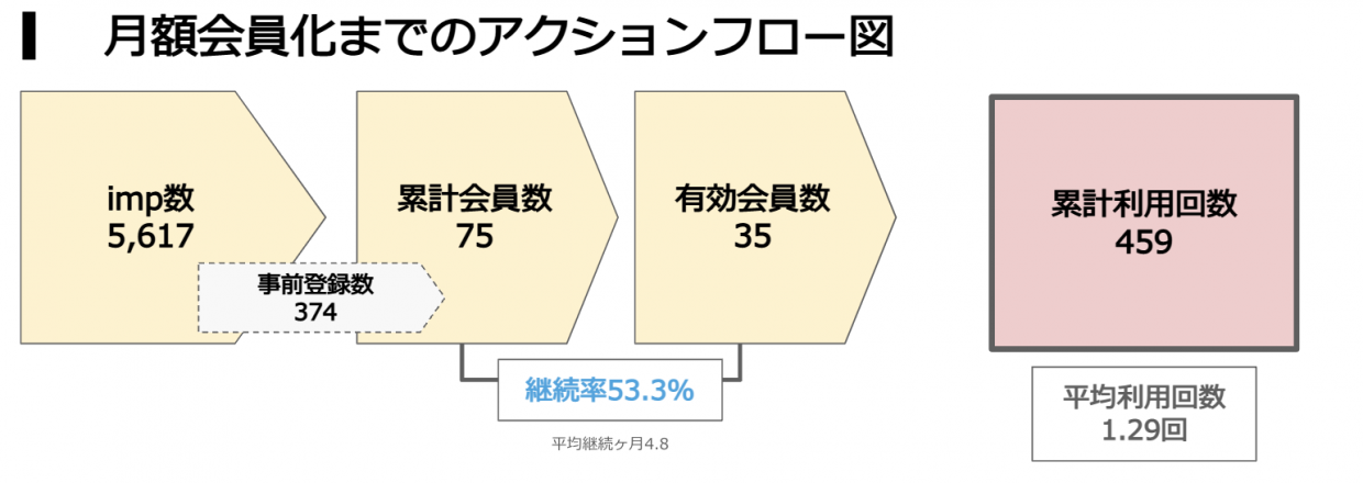 最終的には51店舗に参加いただき、会員の利用回数は合計で459回となりました。会員1人あたり月2回以上利用いただくことを見込んでいましたが、実際には平均1.29回に着地。コロナ禍ということもあり、想定する利用回数には至りませんでした。