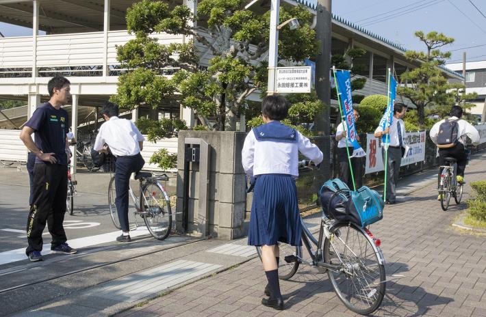 東区では、浜松日体中・高等学校で街頭広報を実施。教員、浜松東警察署の署員、東区役所の職員などが正門前で「交通安全運動実施中」と書かれたのぼり旗を持ち、登校する生徒とあいさつを交わしながら、ルールを守って自転車に乗るように呼びかけました。
