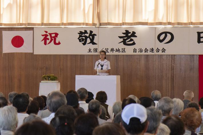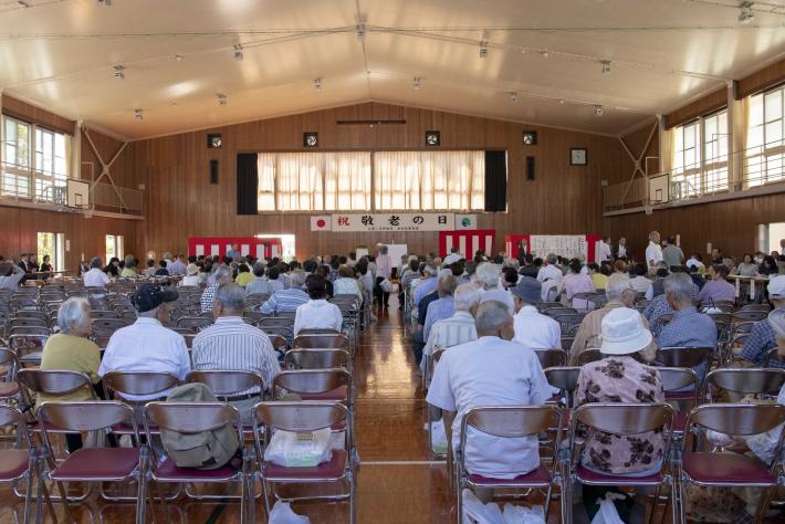 会場には多くの方が参列され、賑やかに敬老会が始まりました。式典では、連合会長や小中学生からのお祝いの言葉、来賓祝辞、祝電披露などが行われました。