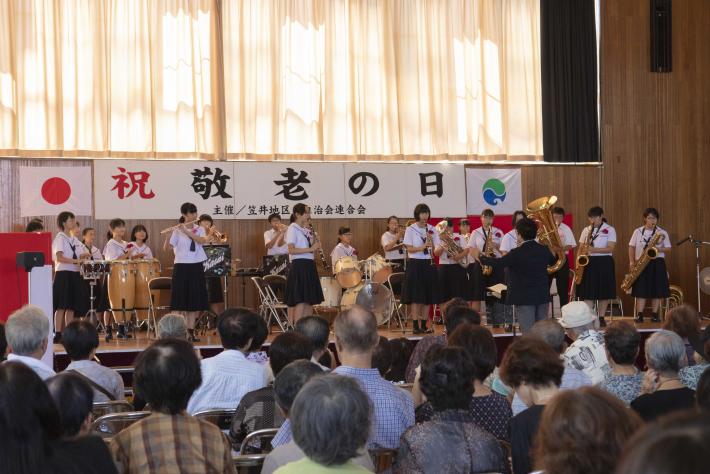 式典終了後の演芸の部では、笠井地区内の小中高校の児童・生徒や地元で活動する団体による演奏、合唱、舞踊など、さまざまな催しが実施され、参列者は音楽に合わせて手拍子を送るなど楽しんでいる様子でした。