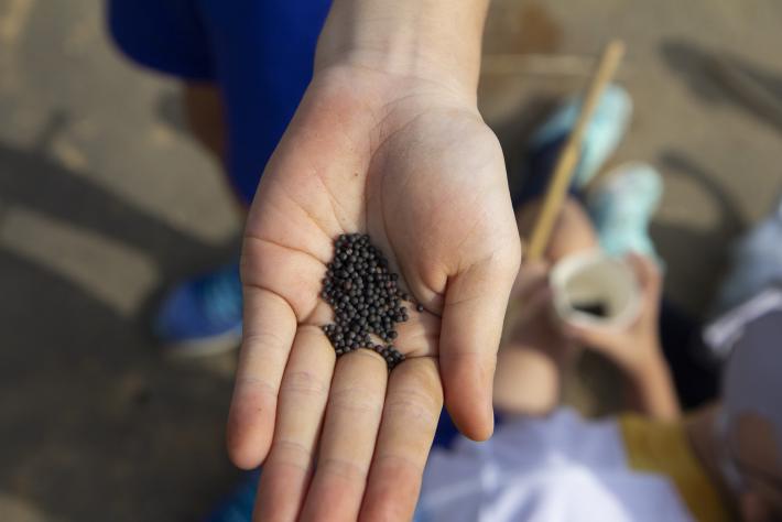 〈菜の花の種。2~3粒をまんべんなく撒きました〉