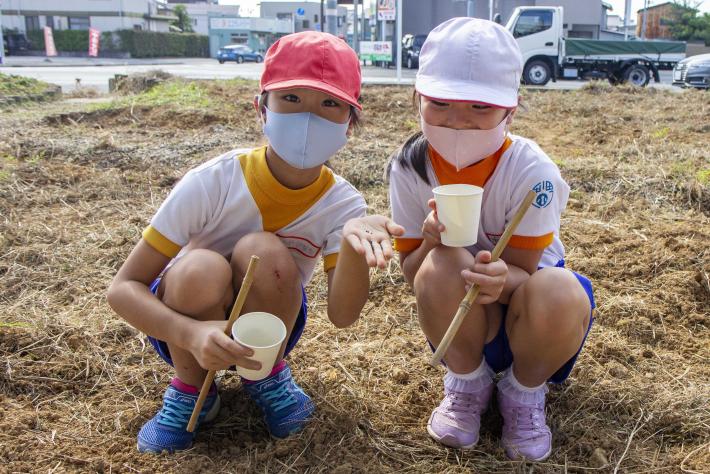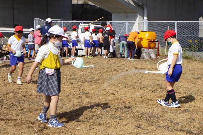 種まき当日は晴天に恵まれ、青空の下、児童らは元気いっぱいに作業。目印のロープに沿って横一列に並び、竹の棒で付けた窪みに種を少しずつ撒き、土をかぶせていきました。最後には、それぞれ持参したジョーロで水を撒き、きれいな花を咲かせるよう願いを込めました。種まきを終えた児童らは、「小さい種を植えるのが楽しかった」「早く花が咲くのが見たい」と笑顔を見せていました。