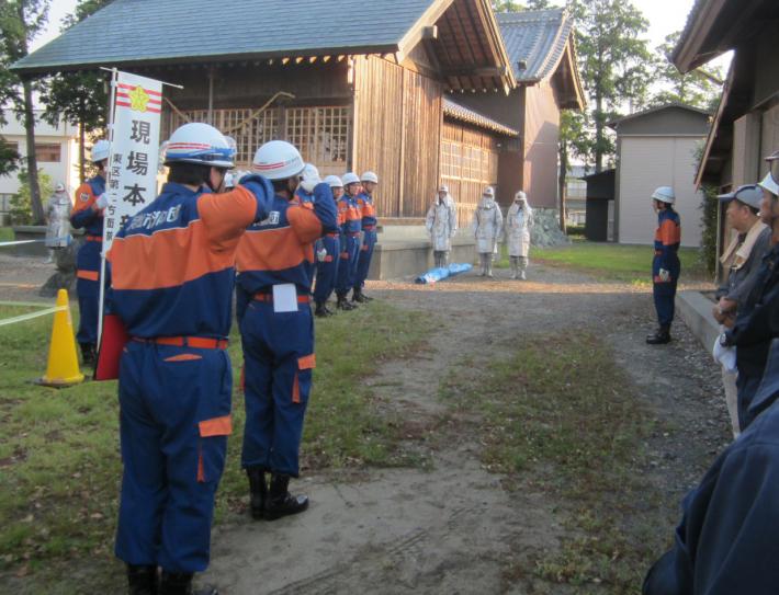 早朝から参加者が一体となって訓練に励んだ後、消防団東区支団長や東区長からの講評、反省会がありました。