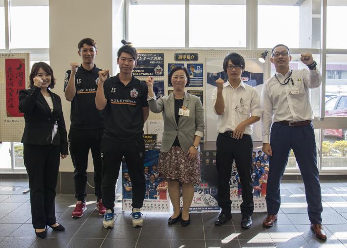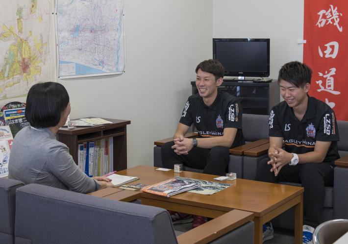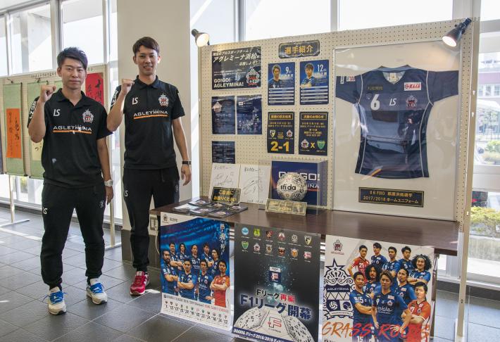 18日(木曜日)には、アグレミーナ浜松の選手2名が東区役所に来庁。チームのキャプテンを務める松浦勇武(まつうらいさむ)選手、山桐正護(やまぎりしょうご)選手はそれぞれ「たくさんの人に応援してもらえると選手のモチベーションにつながっている。今回このようなことをして頂き、とても嬉しく思っている」「応援していただきとても感謝している。だからこそ結果で応えて恩返しがしたい」と語ってくれました。