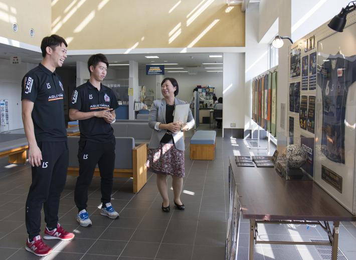 市民サービス窓口の最前線である区役所の利用者満足度の向上を目的とした区役所サービス向上推進事業の取り組みのひとつとして、東区役所1階市民ホールで「アグレミーナ浜松応援ブース」を設置しています。ブースには選手のサイン入りボールやユニフォームなどを置き、選手の経歴などを紹介した公式ガイドブックを配布しています。