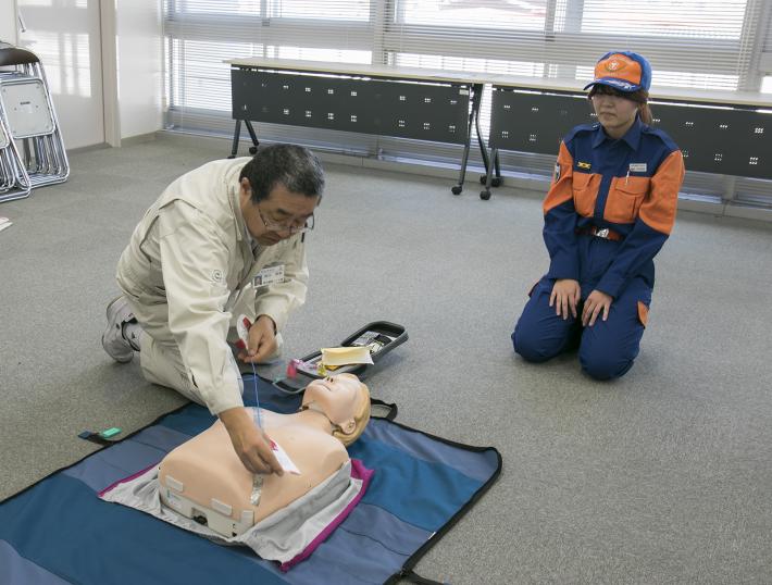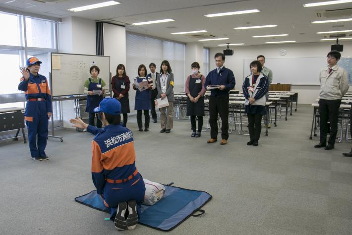 この取り組みは市民サービス窓口の最前線である区役所の利用者満足度向上を目的としており、今回は浜松市消防団教育隊に所属する東区役所の女性職員2名を講師として、職員を対象にAEDの使い方や心肺蘇生の手順についての講義を実施しました。