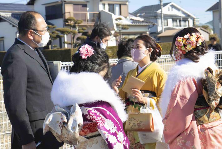 式典に駆けつけた中学時代の恩師は、新型コロナウイルス感染予防のため、式典会場とは別の会場から中継で教え子の門出を祝いました。また、鈴木康友市長からのメッセージでは、「皆さんにはこれから無限の可能性があります。やらまいか精神を持って力強く生きていってください。」とエールが送られました。新成人代表の竹村玲さん(20)は、コロナ禍の中で式を開いてくれたことに対する感謝の気持ちと、「社会の一員として向上心を持って過ごしていきたい。」と新成人としての決意を述べました。
