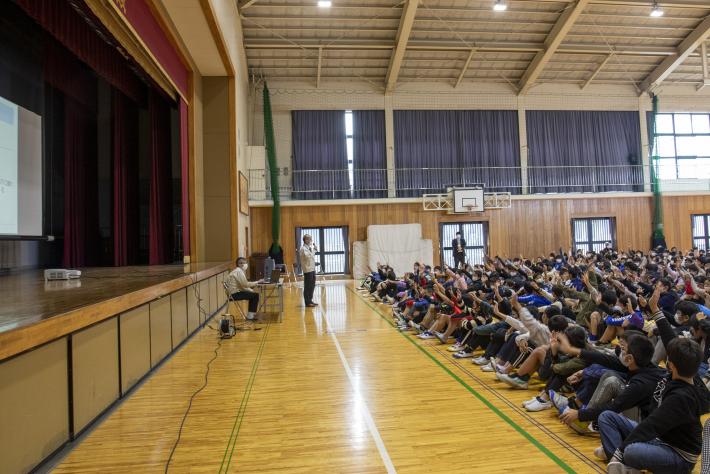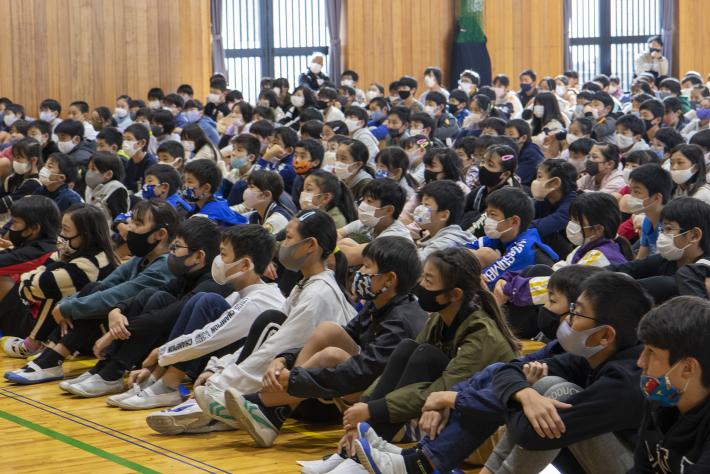 蒲小学校で11月6日(金曜日)、大地震に備えて自分にできることは何か考えてもらおうと防災講座を行いました。5・6年生315人が地震のメカニズムや日ごろの備え、地震発生後の対応などについて学びました。