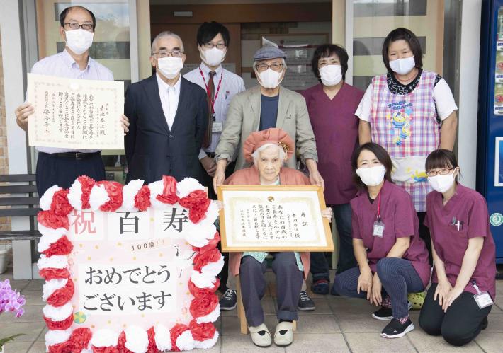 今回訪問したのは、青池春江(あおいけはるえ)さんです。100歳を祝う可愛らしいちゃんちゃんこを身にまとった春江さん。笑顔を浮かべながら寿詞を受け取る春江さんをご家族の方がほほえましく見守る様子が印象的でした。施設のスタッフが「今でもコーラを飲んでいますよ」と元気に過ごす春江さんの様子を語ってくれました。
