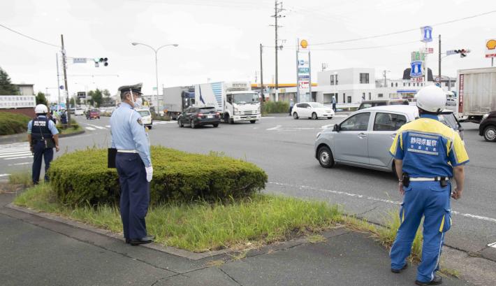 当日は、地域住民、警察関係者及び東区役所の職員およそ40人が参加し、「交通安全運動実施中」と書かれた旗を持って自動車運転手等に安全運転を呼びかけました。この交差点は、通勤通学に利用されているだけでなく、浜松インターチェンジが近くにあることからトラックなどの大型車両も多く行き交う交通事故に特に注意が必要な場所です。