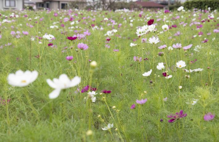 撮影に訪れた時は、三分咲き~四分咲きでした(撮影:9月末)が、きれいに咲く様子を見ることができました。コスモスの花は、10月下旬頃まで楽しむことができますので、ぜひお立ち寄りください。