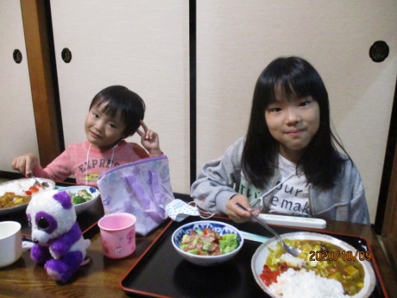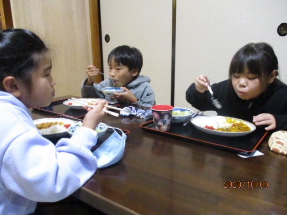 この日の夕食メニューはカレーライスで、「美味しい」と黙々と食べている姿が印象的でした。夕食後は、インドからの留学生とともに、ぬり絵や本読み等を行いました。