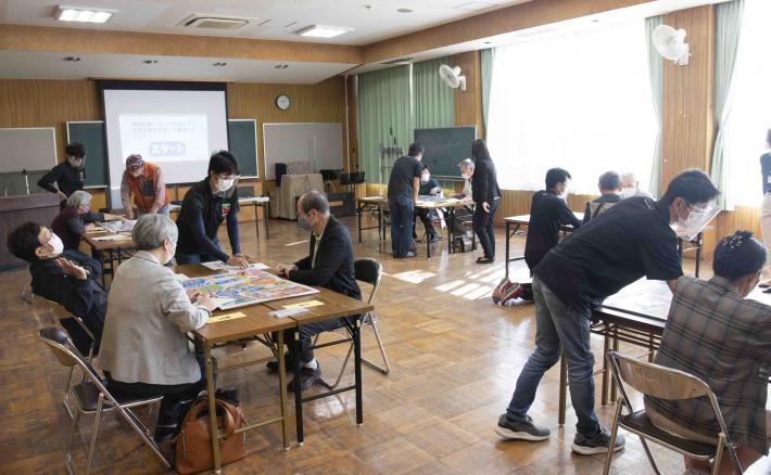 今回の講座には、60歳以上の地域住民12名が参加。参加者は5つのグループに分かれ、各グループに案内役の学生1人がつきました。講座は、特殊詐欺の現状や手法について楽しく学んでもらおうと、すごろくとクイズ形式で実施し、グループごと、すごろく内に作られたクイズを解きながらゴールを目指しました。クイズは、「振り込め詐欺の被害に最も遭っている年代はどれでしょうか」「振り込め詐欺の被害総額はいくらでしょうか」「振り込め詐欺が最も多発する時間帯は何時でしょうか」など全10問。参加者はクイズに苦戦しながらも、同じグループの方と話し合いながら楽しく取り組んでいる様子でした。すごろくの後には、1.オレオレ詐欺2.架空請求詐欺3.融資保証金詐欺4.還付金詐欺の4つの詐欺のシチュエーションを学生が再現し、詐欺について分かりやすく解説しました。