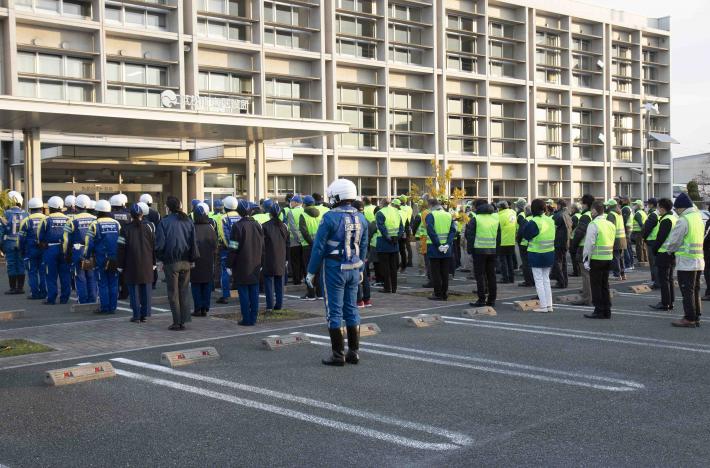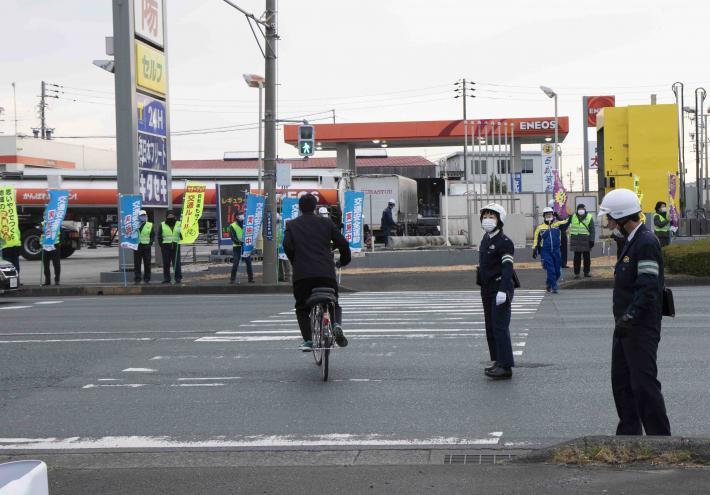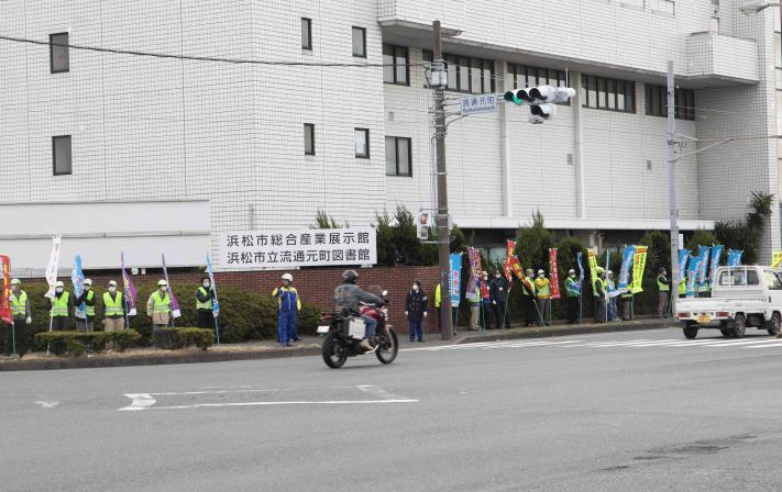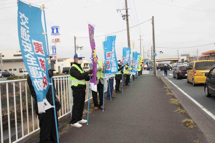 当日は、地域住民、警察関係者及び東区役所の職員およそ140人が参加し、「交通安全運動実施中」、「自転車も守ろう交通ルール」、「夕暮れ時早めのライト点灯」などと書かれたのぼり旗を持って自動車運転者等に安全運転を呼びかけました。この交差点は、浜松インターチェンジが近くにあることからトラックなどの大型車両が多く行き交う交通事故に特に注意が必要な場所です。
