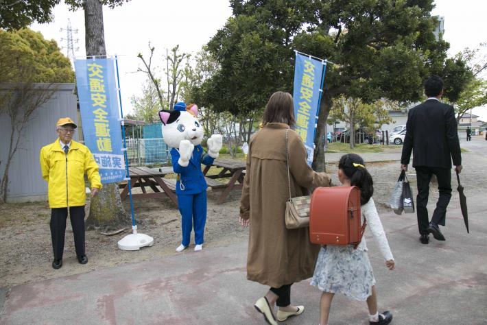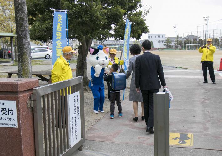 小学校の正門や西側の入口で交通安全ののぼり旗を持ち「入学おめでとうございます」「交通事故に気を付けて登下校してね」などと、呼びかけました。