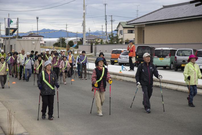ノルディック・ウォークは、2本のポールを持って歩くことで膝や足首への負担が少ない一方、上半身の筋力運動量の増加につながるため、効果的に運動することができます。参加者は列になって協働センターの周辺を歩き回り、楽しみながらチャレンジしていました。