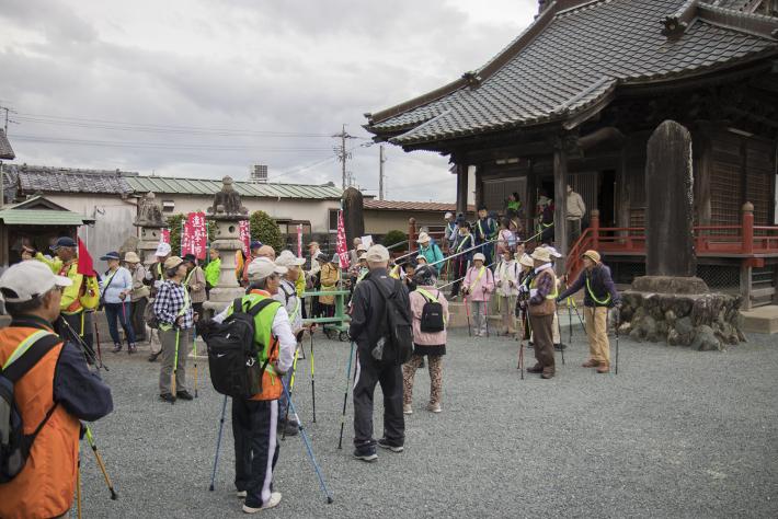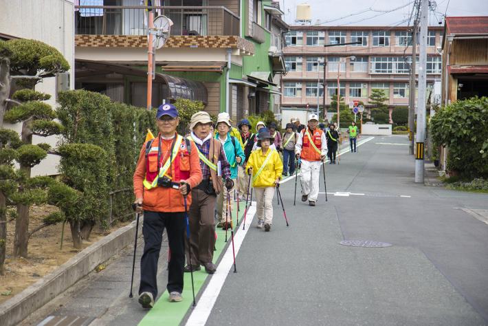 およそ70人が参加し、講師からノルディック・ウォークのコツを伝授した後、ポールを持って歩く練習をしました。その後は、春日神社や笠井観音、源長院など、笠井地区の歴史や文化を感じることができる場所を巡る、およそ3キロのコースをノルディックポールを持って歩きました。