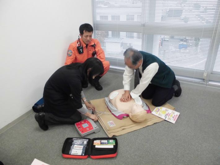 初期消火訓練、消火器を使った消火訓練、心臓マッサージおよびAED取り扱い訓練などが行われ、いざという時の対応や役割などを確認しました。