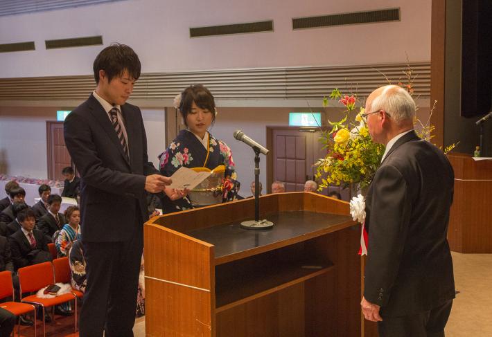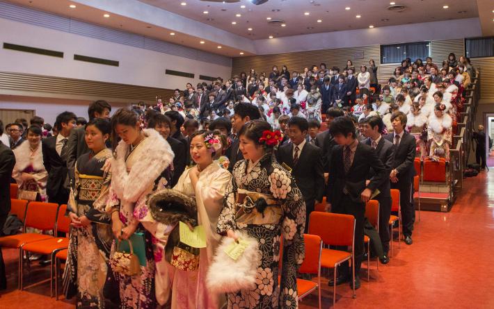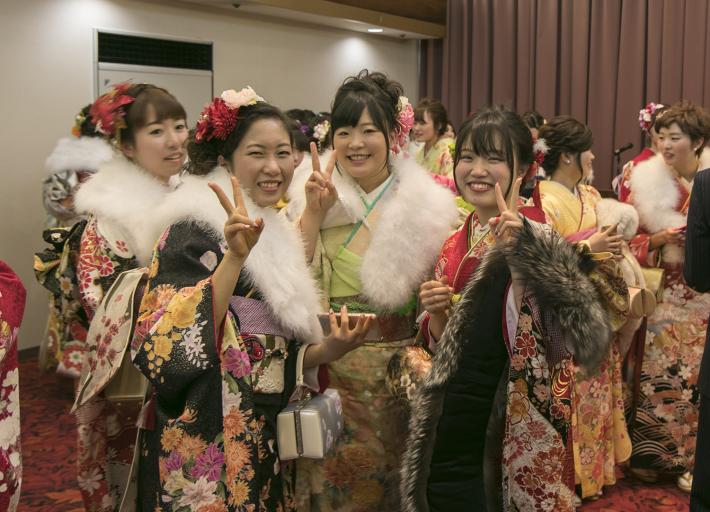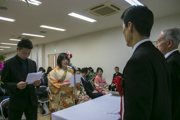 恩師や旧友と再会し思い出話で賑わっていた会場も、式が始まると厳かな雰囲気に包まれ、新成人たちは引き締まった表情で参加していました。