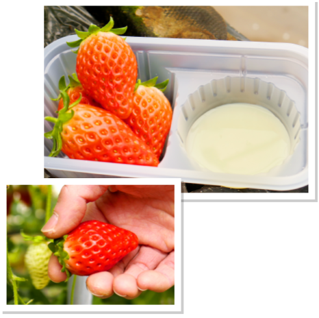 摘みたてのいちごを心ゆくまで味わえるいちご狩り。最近は高い位置で栽培する高設栽培が主流なので、バリアフリーで楽しめます。完熟したいちごの見分け方は、ヘタが反り返り、ヘタの下まで赤くなっていること。表面のツブツブも赤くなっていたら間違いありません。いちごは先の方が甘いので、ヘタを取って上から食べると全部甘く食べられます。はじめはいちごだけを味わい、次にミルクをつけて食べると味の変化が楽しめます。注意したいのは、いちごの摘み方。真下に引っ張ると根元から抜けてしまうので、実のつけ根を持って上に持ち上げる感じで摘むのが正解です。