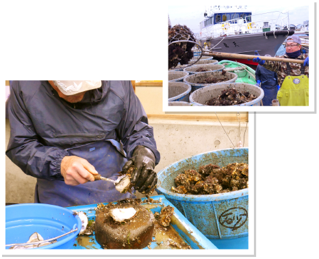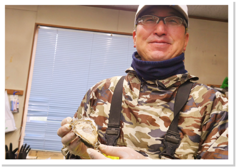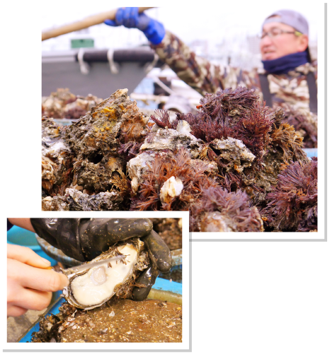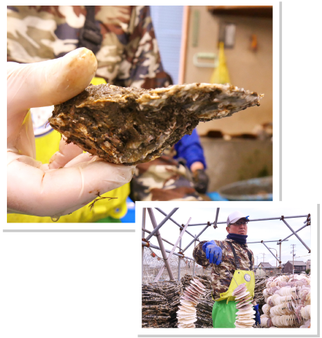 カキの養殖は7月から始まります。北海道から買い入れたホタテの貝殻を10~15ミリ間隔で針金に通して円形にしたものを今切れ口付近に入れ、水中に漂うカキの種を付着させます。ホタテについたカキが成長してきたら、針金の中での間隔を広げ、干満の差が大きい場所へ移動。その環境の中で生き残った強いカキを、翌年の初夏に育成場にひろげます。秋からはプランクトン豊富な奥浜名湖に運んで育てます。このように成長段階に応じて最適な場所へ移動させながら、ゆっくりとおいしいカキに育てていくのです。また、地元の種がうまく育たなかった場合に備えて、秋には仙台から購入したカキの種の育成も始めます。