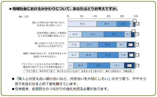 「隣人との支え合い助け合いなど、付き合いを大切にしたい」のそう思う、ややそう思うを合わせると約7割を越えています。