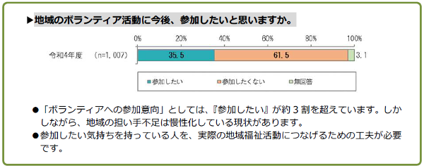 「ボランティアへの参加意向」としては、『参加したい』が約3 割を超えています。しかしながら、地域の担い手不足は慢性化している現状があります。