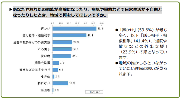 「声かけ」(53.6%)が最も多く、以下「話し相手・相談相手」(41.4%)、「通院や散歩などの外出支援」(23.9%)の順となっています。
