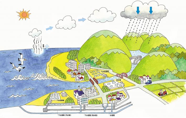 最初に水の循環(海の水が蒸発して雲になり、雨を降らせ、川や海に流れ、これがこれが繰り返されること)と、この水の循環の中から私たちが水を得て生活していることを説明することにより、下水道の位置づけ(必要性)を認識します。