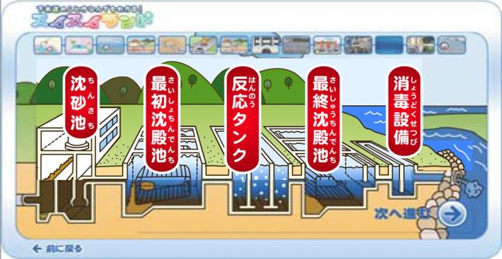 「ヨシズミさん、りゅうさん、てんさん」と共に下水道の仕組みや、使って汚れた水はどのようにきれいになっていくのか、わかりやすく説明します。