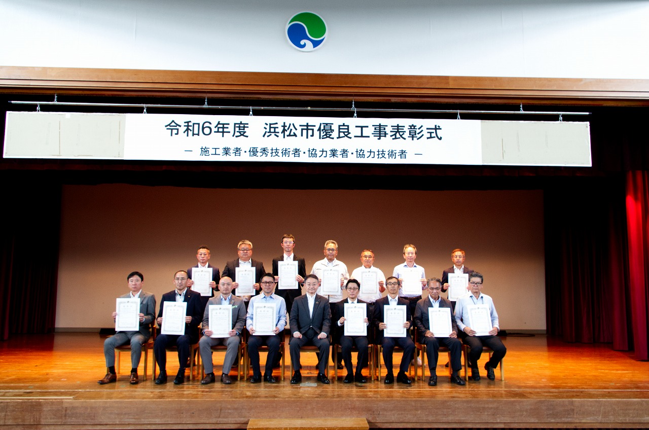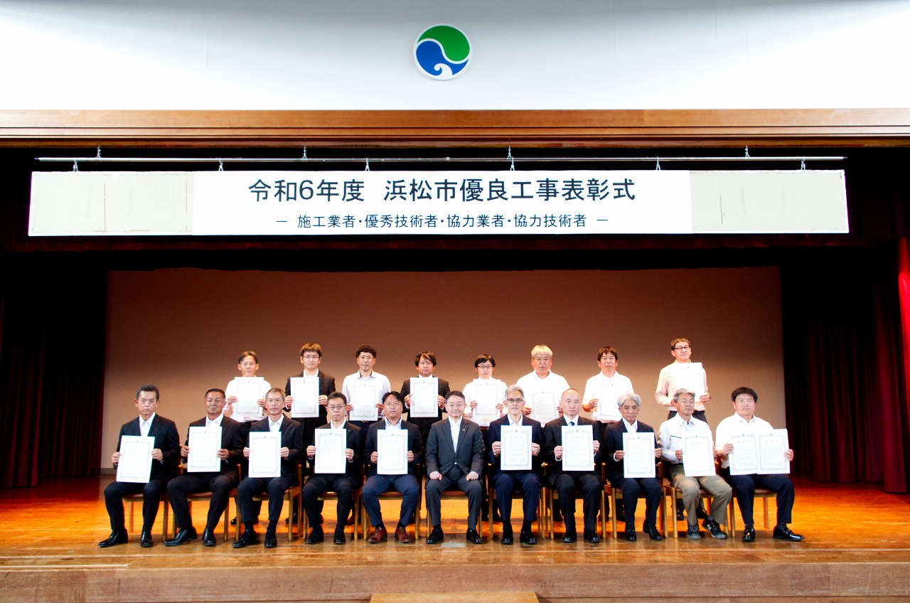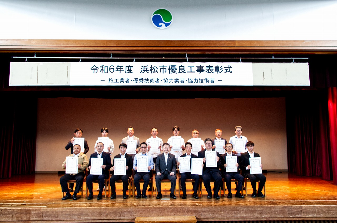 浜松市では、建設業者全体の資質の向上を図るため、浜松市が発注した500万円以上の建設工事の中から、他の模範となる成績を修めた施工業者及び技術者並びに品質向上に貢献した協力業者及び協力技術者を選び、表彰しています。