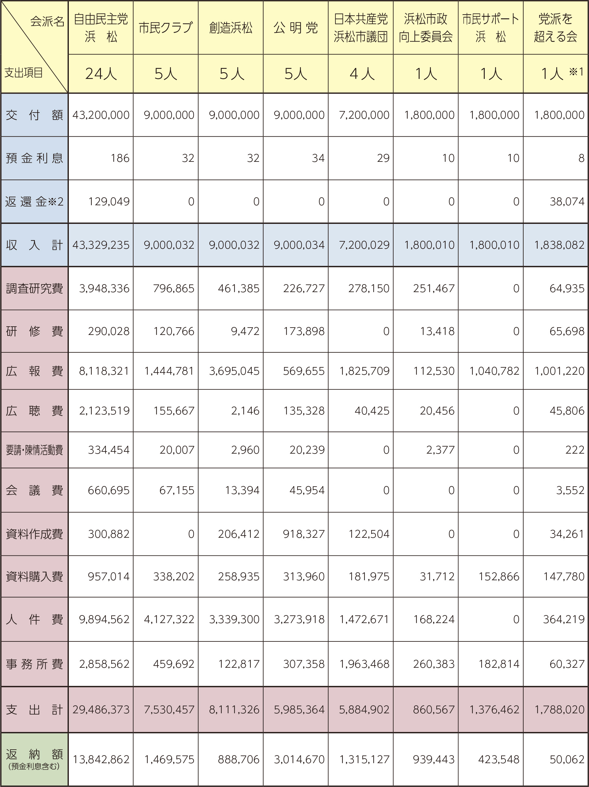 | ※2 | 政務活動費で購入した備品を耐用年数(減価償却)が終了する前に処分する場合、残存価値を現金換算し、市へ返還します。(一旦会派で預かる形となるため、収入欄に記載しています。) |