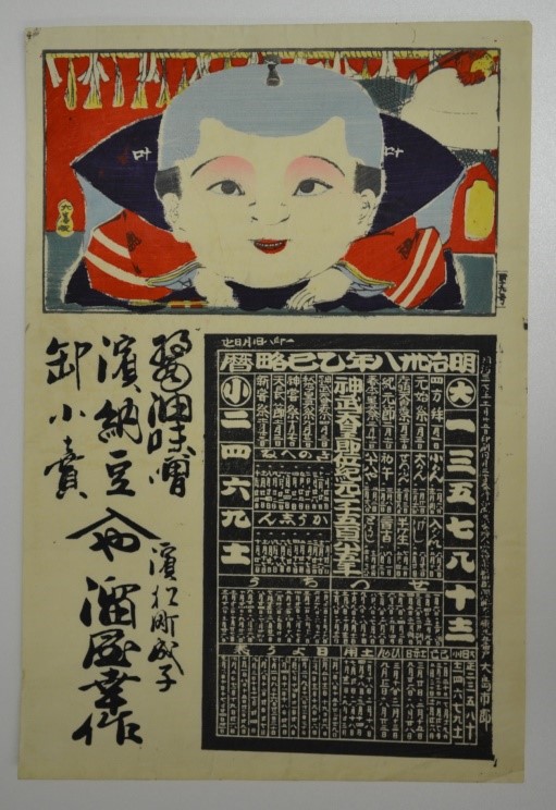 まちなかの商店でも家印をもっていた店が多くありました。商店が作成した引札やうちわ、通い徳利等にも家印をみることができます。写真の右横にあるのが、それぞれの家印です。