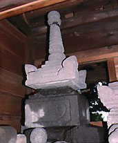 浜松市豊町、服職神社参道脇にある祠の中に祀られている。関西形式の宝篋印塔。石材は砂岩。14世紀半ば頃の造立。