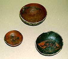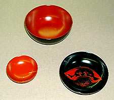 左写真の城山遺跡の出土品をもとに、木地に漆を塗って、製作当時の漆椀を新たに製作しました。