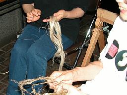 ひざの上でよりをかけて、糸をつくります。