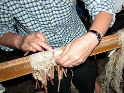 編み台の上で、横糸に縦糸を交互にからませて、布にしていきます。